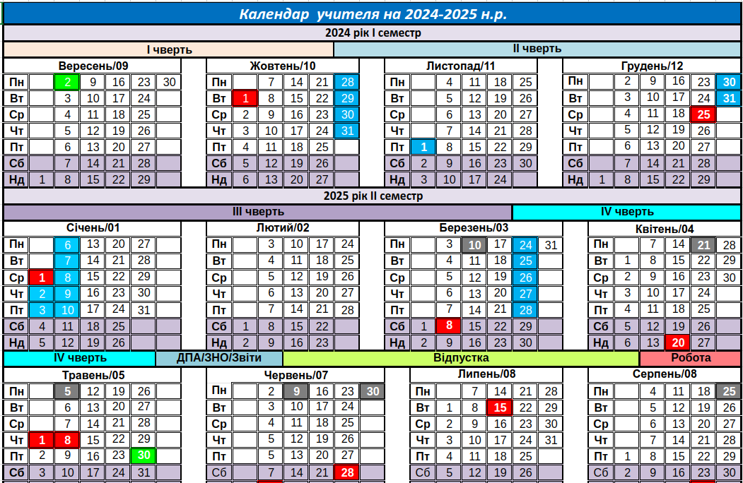 Календар відображає інформацію про структуру навчального року: дати Першого та Останнього дзвоників, дні осінніх, зимових та весняних канікул. Для зручності перегляду на мобільних пристроях можна "тапнути" та збільшити.